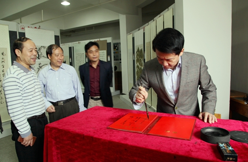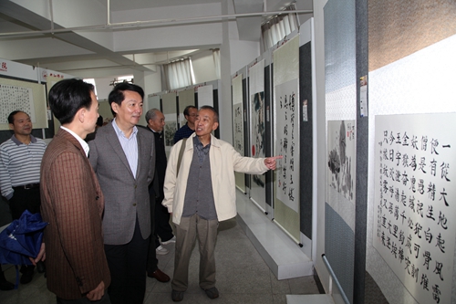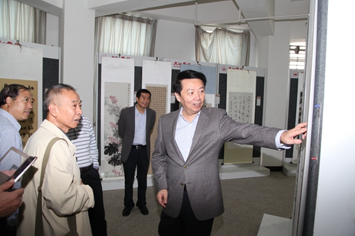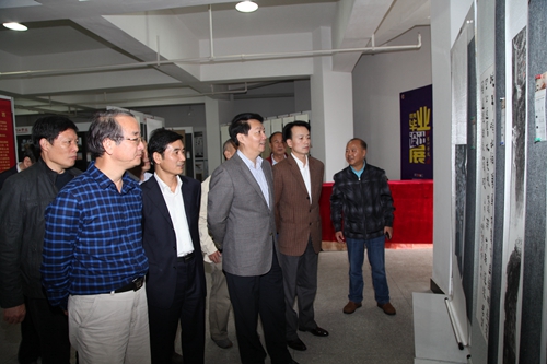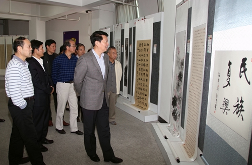 丹青献瑞,翰墨流香,镜像叠彩,歌诗呈祥,好一派升平气象。校领导一行来到逸夫楼书画摄影展览厅。首先进入眼帘是展览前言、“长征”书法作品,“长征”两字是校党委书记郑翔为本次展览所书。接着,是几幅在国内、省内享有盛誉的我校离退休教师的书画作品,郑翔等校领导仔细地观看了这些书画作品,了解了作品及其作者本人的有关情况。郑翔等校领导还一一地观看了其他在职教职工和离退休职工的书画摄影作品,并对本次展览组织工作以及展出的作品给予了充分肯定。郑翔还在现场挥毫敬录毛主席诗句:红军不怕远征难。