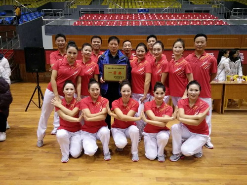 由我校16名老师组成的代表队,以刚劲有力的动作、整齐划一的步伐,丰富而愉快的表情,充满青春与激情的表演,获得了本次比赛的冠军,特别是“金字塔式”的高难度造型让裁判和观众眼前一亮,赢得一片喝彩和掌声。