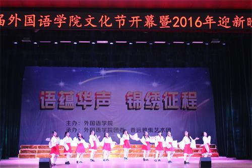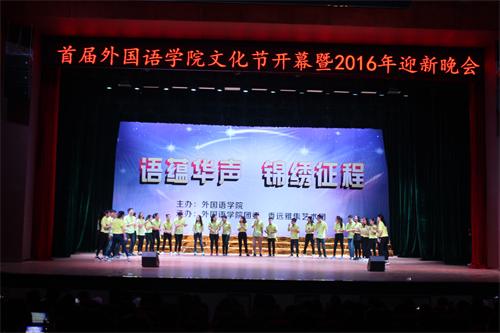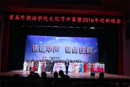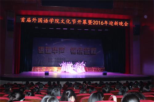 11月16日晚,外国语学院首届“文化节”暨2016年迎新晚会于校大礼堂隆重举行,校纪委书记魏立平、学生处处长刘平、校团委书记闫来英、外国语学院院长韩琨、院党委书记杨杰、副书记彭晓及师生代表千余人观看了此次演出。