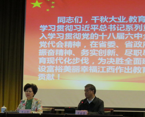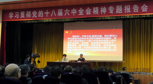为认真学习贯彻党的十八届六中全会和省十四次党代会精神,大力推进“十三五”期间我省教育改革发展各项工作,11月22日,省委教育工委在南昌举行学习贯彻党的十八届六中全会和省第十四次党代会精神专题报告会。省委教育工委书记黄小华作“学习贯彻党的十八届六中全会和省第十四次党代会精神,坚持中国特色社会主义道路,办好人民满意教育”专题报告,省教育厅巡视员周金堂主持报告会。省属本科高校党委副书记、组织部长、宣传部长以及教工党支部书记代表,全省高校第39期处级干部培训班学员等共360余人聆听报告。我校党委委员、副校长杨耀防及组织人事部副部长兼统战部部长周敏、八里湖管理办公室书记邓燕、宣传部副部长陈晓松出席报告会。