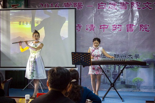 随后,“《诗情中的书院》——以配乐诗朗诵的形式解读书院文化”的书院文化之旅活动正式开始。郑州大学王梦晗、张泽启、宋昊宇、刘洁颖、靳盺、余广涵等六名同学分别表演了《闪耀吧青春的火光》、《我是一棵树》、《相和歌·子衿》《嵩阳书院千年庭院》以及《牧羊曲》等。我校国学班成员严跃新、程欢、刘畅、谢云盛等朗诵了《历史情境中的白鹿洞书院》、《白鹿仙踪》、《游白鹿洞歌》、《行香子·题白露》以及《云中颂·庐山》等节目。双方节目涵盖了诗歌朗诵、舞蹈、演奏等表演形式。最后,两校同学联合朗诵了《嵩阳——白鹿为了与你相遇》诗作。同学们表演的节目异彩纷呈,声情并茂,不拘一格,精妙绝伦,展示了他们各自青春洋溢的气息以及积极向上的心声。