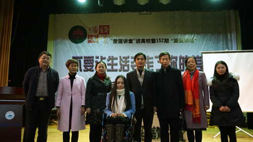 讲座开始前,播放了介绍董明老师的专题片《轮椅上的天使》,一幕幕令人感动的画面感染着现场每一个人的心。9岁时,董明老师跳水训练时因保护队友而摔成高位截瘫,被医生下了三次病危通知书的她,靠着她的坚强意志与信念熬过了最难度过的不能说话的10年,期间她自学了小学到高中的课程,成为了一名英语、日语老师。在投身志愿事业后,她在汶川地震救灾中担任心理咨询师,在北京奥运会、伦敦奥运会担任奥运火炬手……她用这个短片诠释了她出其不意的磨难与不忘初心的历程。