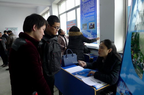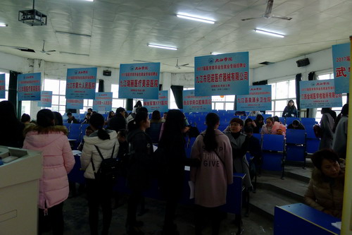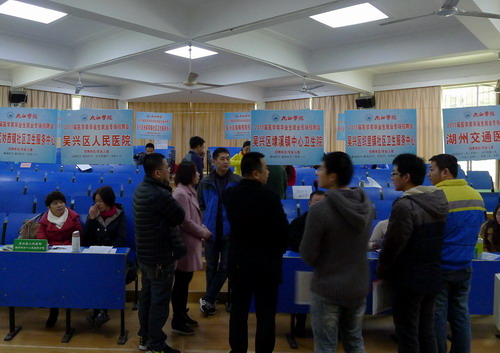 招聘会上,浙江湖州吴兴区卫计局、人事局组织了17家医院和卫生机构前来招聘,带来了100多个就业岗位,达到了预期效果。同学们一个个充满自信的拿着个人简历,选择自己适合的用人单位,他(她)们着装整齐、举止大方,充分展示了九江学院学子良好的精神风貌,个个都争取把自己最优秀的一面呈现给各用人单位;各用人单位也争先恐后以展板、解说等形式让同学们了解他们,以便能优先选择他们。此次“双选会”,得到了学校大力支持,校领导亲临会场指导,并与多家用人单位和部分应聘毕业生进行了交流。