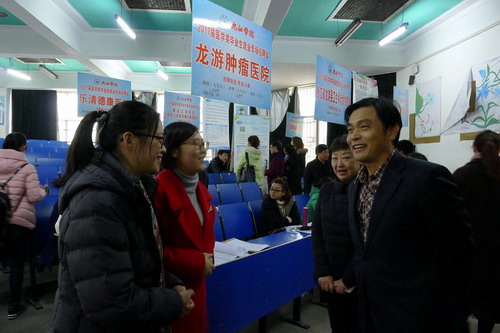 12月18日,我校2017届医学类毕业生就业洽谈会在庐峰校区举行。为了更好地做好医学类毕业生的就业工作,副校长杨耀防、夏启国,招生就业处处长肖国丰,医学部主任许礼生、副主任向维聂,临床医学院院长张志平、党委书记张南华、副院长贾宗林,护理学院党委书记丁蓉,亲临招聘会场,了解招聘情况,指导毕业生就业工作。