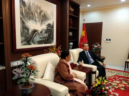 捐赠仪式前,熊波大使在中国驻柬埔寨大使馆会见厅会见了克罗媞达院长一行。熊波大使感谢王家研究院多年来给予孔子学院的大力支持,他说,柬埔寨孔子学院发展很好,已经成为柬埔寨汉语教学和中柬人文交流的桥梁和纽带。孔子学院的快速发展,得益于柬埔寨政府、社会各界和王家研究院的大力支持,中国驻柬埔寨大使馆将一如既往地支持孔子学院的建设。