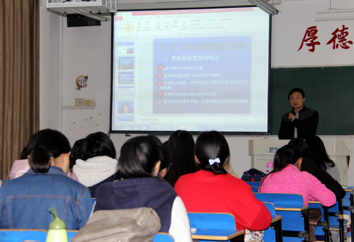 课堂从同学们介绍“两会”新闻内容开始,黄群老师对同学们的新闻简述进行了解说并拓展了相关内容,引入本节课的课程教学。通过趣味故事和大量的视频、音频资料,深入浅出的讲解了世界经济发展的特点及主要问题。魏副书记认真地做着笔记,不时地注意着学生们的听课状况。