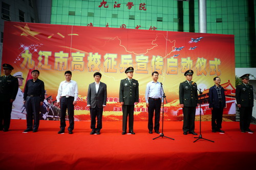 九江军分区司令员宋朝阳在启动仪式上作了讲话。他说,今天的九江市高校征兵宣传启动仪式,标志着九江市2017年大学生征兵工作正式拉开序幕。我代表军分区和各级兵役机关,向关心支持国防事业的九江各高校领导和同志表示衷心的感谢,向热爱国防、献身国防的同学们致以崇高的敬意。长期以来,各高校高度重视大学生征兵工作,出台激励优惠政策,开辟应征绿色通道,大学生参军报国热情越来越高。他指出,九江是“八一”起义的策源地、秋收起义的发生地、中国工农革命军第一面军旗的诞生地、98抗洪精神的发源地,在这片红色土地上,历来有参军报国、拥军支前的光荣传统。应征入伍是每个适龄青年的光荣义务,希望更多的大学生积极响应祖国号召,踊跃投身军营,把“成才梦、事业梦”融入“强国梦、强军梦”,为实现中华民族的伟大复兴作出应有贡献。