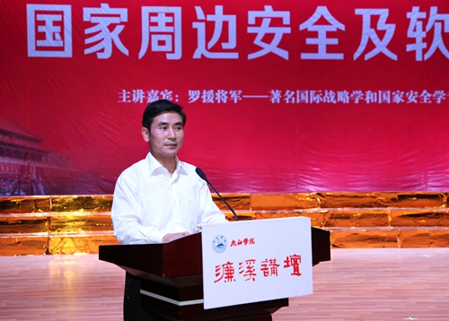 罗援将军的报告不仅是一堂份量厚重的国防教育课,更是一堂饱含深情的爱国主义的教育课,报告强调要大力弘扬民族精神,弘扬爱国主义,要坚决捍卫主权,坚决维护祖国统一,构筑民族精神和爱国主义的钢铁长城。使在场听众进一步认清了当前国防形势和周边动态,增强了国防观念和忧患意识。报告结束后,罗援将军还与现场师生进行了互动,回答了师生提出的问题。罗援将军还为我校濂溪讲坛题词:“与九江学院师生共勉:精忠报国”。
