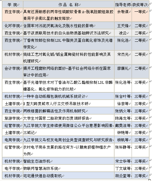 “挑战杯”大学生课外学术科技作品竞赛是高校共青团的品牌活动之一,被誉为当代大学生科技创新的“奥林匹克”盛会,本届“挑战杯”江西赛区竞赛自今年3月启动以来,共收到报备作品4000多件。经过省级初审,共有322件作品进入省级终审决赛。我校选送的18件作品全部进入决赛,参赛作品全部获奖在我校参赛史上尚属首次。