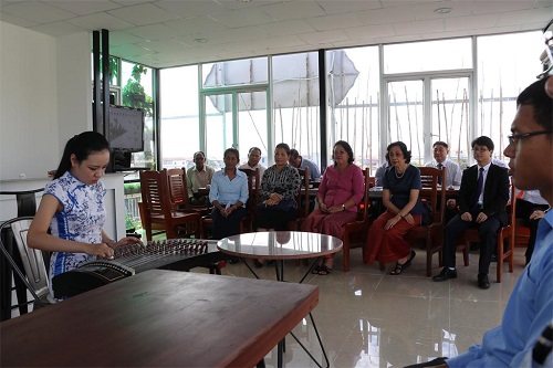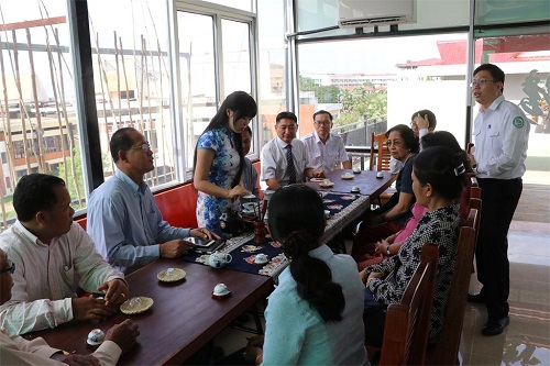 应柬埔寨孔子学院邀请,蔡万宁副部长此行目的是体验中国茶文化。在柬埔寨孔子学院中国茶文化交流中心,孔子学院志愿者汉语教师黄书老师为客人进行了茶艺表演,并介绍了中国茶的历史、茶的分类及其功效、茶具的名称和内涵。田唱老师弹奏了《琵琶语》、《云水禅心》等经典古筝曲目。众人在优雅的中国古典乐曲中,体验中国茶文化,沉浸在中国文化氛围中。柔和动听的琴声和阵阵茶香,驱走了午后的炎热,其乐融融。蔡万宁高兴地用刚学会的汉语说:“中国茶,好!”