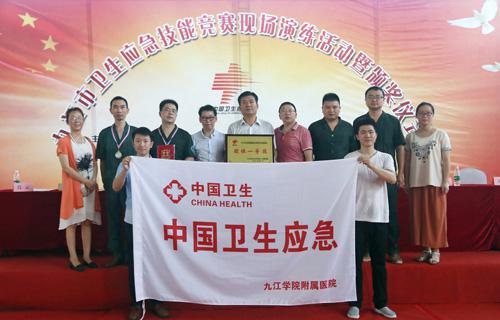 为积极响应国家卫计委和省卫计委提出的卫生应急竞赛活动要求,提升广大卫生应急工作人员的业务能力和专业水平,7月28日,由市卫计委组织的九江市卫生应急技能竞赛表演及颁奖活动,在九江职大新校区体育馆举行。省卫计委副主任万筱明、九江市政协副主席严平及市总工会、市卫计委、市疾控中心、市急救中心等领导出席了活动。临床医学院/附属医院纪委刘英明书记、急诊科但传军主任带队参加,参赛队喜获团体一等奖佳绩。