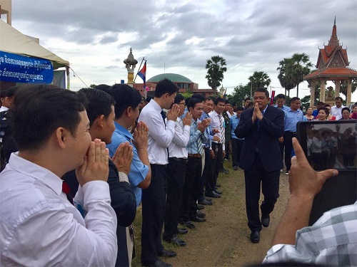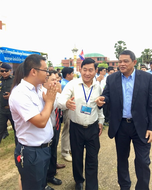 10月7日上午8:30,柬埔寨王国副总理高金然阁下(H.E.Ke KimYan)莅临柬埔寨棉芷大学视察工作,并为卜迭棉芷省优秀高中生颁发奖品。棉芷大学中文系全体教师带领中文系学生身着中国和柬埔寨传统服装迎接高金然副总理的到来。