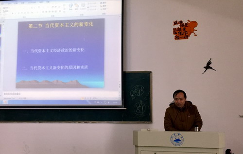 课堂上,王辉老师讲授的内容是“当代资本主义的新变化”。王辉老师课前播放相关视频资料,课上联系实际,举例恰当,学生认真听讲,积极和老师互动,课堂教学效果良好。