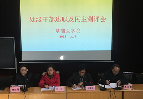 元月9日下午,基础医学院在浔东校区立本楼三楼报告厅召开了2017年度处级干部述职及民主测评会,杨耀防副校长出席会议并讲话。组织人事部副部长周敏、户晗老师、学院领导班子,全体教职工参加会议。会议由周敏副部长主持。