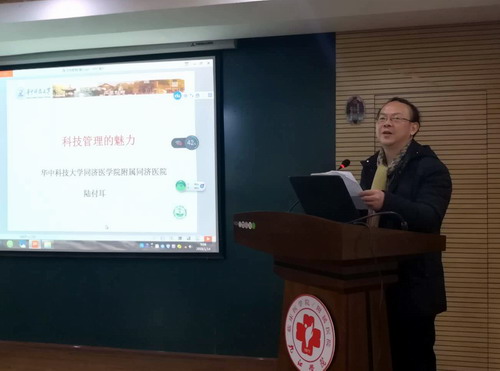 1月14日上午,华中科技大学同济医学院附属同济医院陆付耳教授应邀来基础医学院,在庐峰校区办公楼四楼会议室作了题为《科技管理的魅力》的学术报告。车向新院长、张南华书记、胡志坚副院长、郑美蓉副院长及基础医学院、临床医学院的部分老师参加报告会。本次学术报告由车向新院长主持。