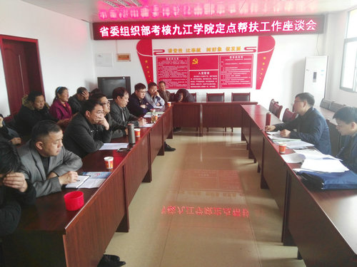 考核组一行听取了九江学院驻村工作队以及乡村负责人的扶贫工作情况汇报,现场查阅了三年来驻村扶贫工作相关的档案材料,并实地考察了“扶贫车间”、产业基地等帮扶项目工程,与部分贫困户代表和党员、群众代表进行了座谈,深入了解贫困户的生产生活情况,并对九江学院驻村工作队进行了现场测评。