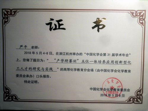 7日上午,严平教授的口头报告题目为““产-学-研-训-赛”五位一体培养应用创新型化工人才的研究与实践”,报告会由谢在库院士主持。报告围绕“为什么做——五位一体人才培养模式改革的必要性”、“怎么做——研究内容、创新及特色”、“做的如何——模式实施效果及推广情况”三方面展开,系统汇报了我校化工类专业“产学合作、学科联盟、教研融合、以训强能、以赛促学”五位一体培育应用创新型人才的有效探索经验和做法。
