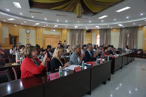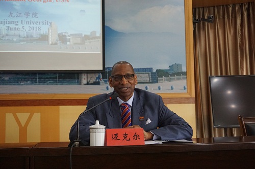 欢迎仪式上,刘晓东校长代表学校致欢迎辞,他首先表达了对迈克尔·莱尼团长及萨凡纳市教育工作者全体嘉宾的问候,对远道而来的美国客人表示热烈的欢迎。他简单介绍了九江学院的办学历史与规模、办学特色和国际交流情况。刘校长说,今年是我校第二次承接美国萨凡纳市教育工作者中国文化体验团,我校高度重视并做了精心安排:既有教学实践、又有学术讲座;既有大学座谈交流,也有中小学考察观摩;既有自然风光欣赏,又有人文景观体验。同时,我们还会走出九江,感受景德镇的陶瓷文化、北京的古都文化等。相信此次项目一定会为萨凡纳市教育工作者了解中国及中国文化、促进中美相互交流和友好起到了很好的作用。最后,刘校长对各位美国校长和教师积极参与孔院活动表示由衷的感谢,对迈克尔·莱尼团长为孔子学院的发展所付出的努力和心血表示赞赏,并相信在迈克尔·莱尼团长和我校选派的中方院长罗其娟的共同努力下,两校通力合作,萨凡纳州立大学孔子学院一定会发展得越来越好。