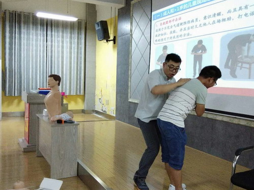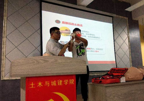 培训中,钱老师通过通过PPT演示、现场模拟操作、学生互动等方式讲授了心肺复苏和气道异物梗阻等理论知识、灾害现场的创伤救护及处理以及场景模拟等。为了使学生更深入了的了解各项救护技巧、掌握心肺复苏要领,培训老师将学员们分为二组,分别对心肺复苏等进行了实操演练、手把手向同学们传授了急救手法和注意事项,同时要求学员们熟练掌握心跳或呼吸骤停的现场急救、AED的使用、止血、包扎、骨折制动固定、搬运伤员等救护技术。最后,对学员们进行现场技能操作考核。