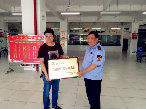 根据江西省食品药品监督管理局《关于深入推进“实施洁厨亮灶,治理餐桌污染”工作的通知》(赣食药监办餐[2017]9号)和《关于授予2017年度“洁厨亮灶”省级示范单位的通知》(赣食药监食品经营〔2018〕4号),充分发挥示范单位典型引领作用和示范带动效应,倡导浓厚食品安全社会共治氛围,日前九江学院八里湖学生食堂等单位被正式授予2017年度江西省“洁厨亮灶”省级示范单位。7月4日,九江市开发区食品药品监督局陶先平局长一行来学校进行了现场授牌和颁奖。