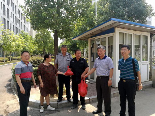夏副校长巡查了校区,走访了校区保卫科、门卫室、学生宿舍及岗亭,对坚守岗位的值班人员表示慰问,并送上了消暑的西瓜和绿豆,叮嘱大家要注意防暑。
