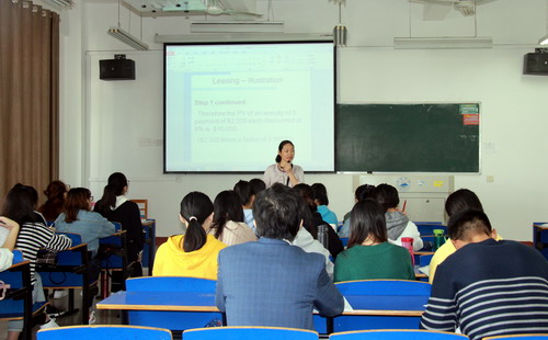王副校长首先来到立信楼312教室,听取了郭英老师对经营性租赁转换为资本性租赁的报表重述的讲解。紧接着,王副校长前往立信楼413听取了李晓玉老师对股票、基金等金融工具的讲解。郭老师英文流利,讲课条理性强;李老师准备充分,专业知识过硬。两堂课上学生都非常专注,学习气氛浓烈。王副校长与同学们一同听讲,并细心观察两堂课上的一些细节问题,认真做了笔记。