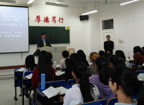 课堂上,洪老师用多媒体教学手段,结合大量的案例给大家讲了商品的包装和设计,生动具体,和学生互动频繁,王副校长聚精会神听取教师授课,认真做了课堂笔记。