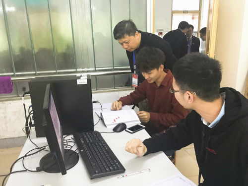 评估专家梅锦春教授在电子设计与开发实训室考察,并与做实验的同学进行交流。