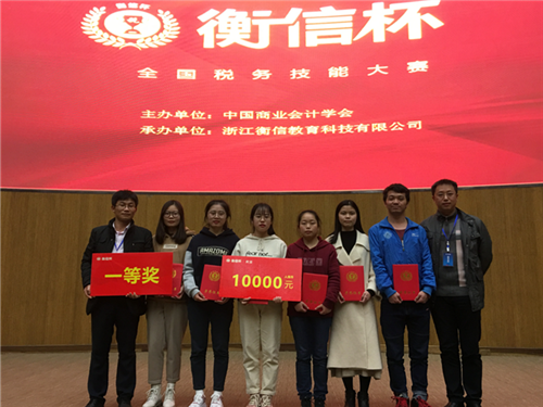 2018年全国税务技能大赛总决赛于11月21、22日在浙江杭州成功举办。九江学院代表队在领队会计学院党委副书记罗维、指导老师蔡报纯副院长、唐小明老师带领下,2016级会计学专业卓越班黄小凤、龚亚男、卢懿三名同学不负众望,以323.227分的总成绩获得本科组团体总分第一名,卢懿取得税务公务员岗位个人奖第一名,黄小凤取得办税员岗位个人奖第二名。同时,九江学院会计学院刘聪燕、吴菲、张莹三名同学获得专科组“团体三等奖”。