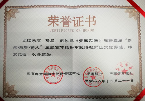 此次活动共有全国近700所高校的13万部作品参赛,其中文字作品11万篇,全国评选教师征文优秀作品50名,九江学院会计学院杨晶老师的作品《青春无悔》在本次活动中脱颖而出,获得全国教师征文优秀奖。