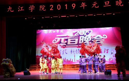 伴随着欢快热情的舞曲,由体育学院龙狮队表演的《二龙戏珠》,招式多样,变化灵活,展现龙狮的精、气、神、韵,表达了人们送走了旧的一年,迎来生机勃勃的新的一年。预示着九江学院2019年是平安的一年,祥和的一年,丰收的一年。由艺术学院尹晖、张立侠等同学表演的歌伴舞《我爱我的祖国》,你如仙境的村落,你如星光的灯火,如诗如画的是你,是你万里的山河,望江山的史册展人民的杰作,方圆九洲的沃土耕耘你新的传说……”唱出了中国人民为了建设祖国付出了巨大的艰辛,取得了辉煌的成就,我为我的祖国感到骄傲和自豪!由学生处、校团委刘诗雨、张璐等表演的舞蹈《灼灼芳华》,她们用美妙的舞姿,演绎了她们对艺术、对舞蹈的理解和热爱。展现当代大学生蓬勃向上的青春气息。扶贫工作是党中央、国务院的一项重要战略部署。学校党政领导高度重视,学校的扶贫工作取得了丰硕的成果。由艺术学院王一晴、王梦迪等表演的女声小组唱《山杏花开是时候》。她们用甜美的歌声,描绘了扶贫干部带领乡亲们修路架桥,尽职尽责地工作,生动地描绘出了一幅春光无限、丰收在望的美好场景,象征老百姓对幸福美好生活的热切向往。
