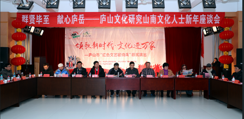 1月15日,庐山文化研究山南人士新年座谈会在庐山市文化馆举行。庐山市文化界人士代表与九江学院庐山文化研究中心研究人员近40人,相聚一堂,共话庐山文化研究使命。江西省人民政府原副省长、江西省地域研究会总顾问、九江学院研究中心学术委员会主任胡振鹏,九江学院党委副书记魏立平、副校长陈春生及山南文化界知名人士欧阳森林、余宏英、查筱英、王忠芳、刘希波、释能行、袁晓宏、郭东山等出席座谈会。